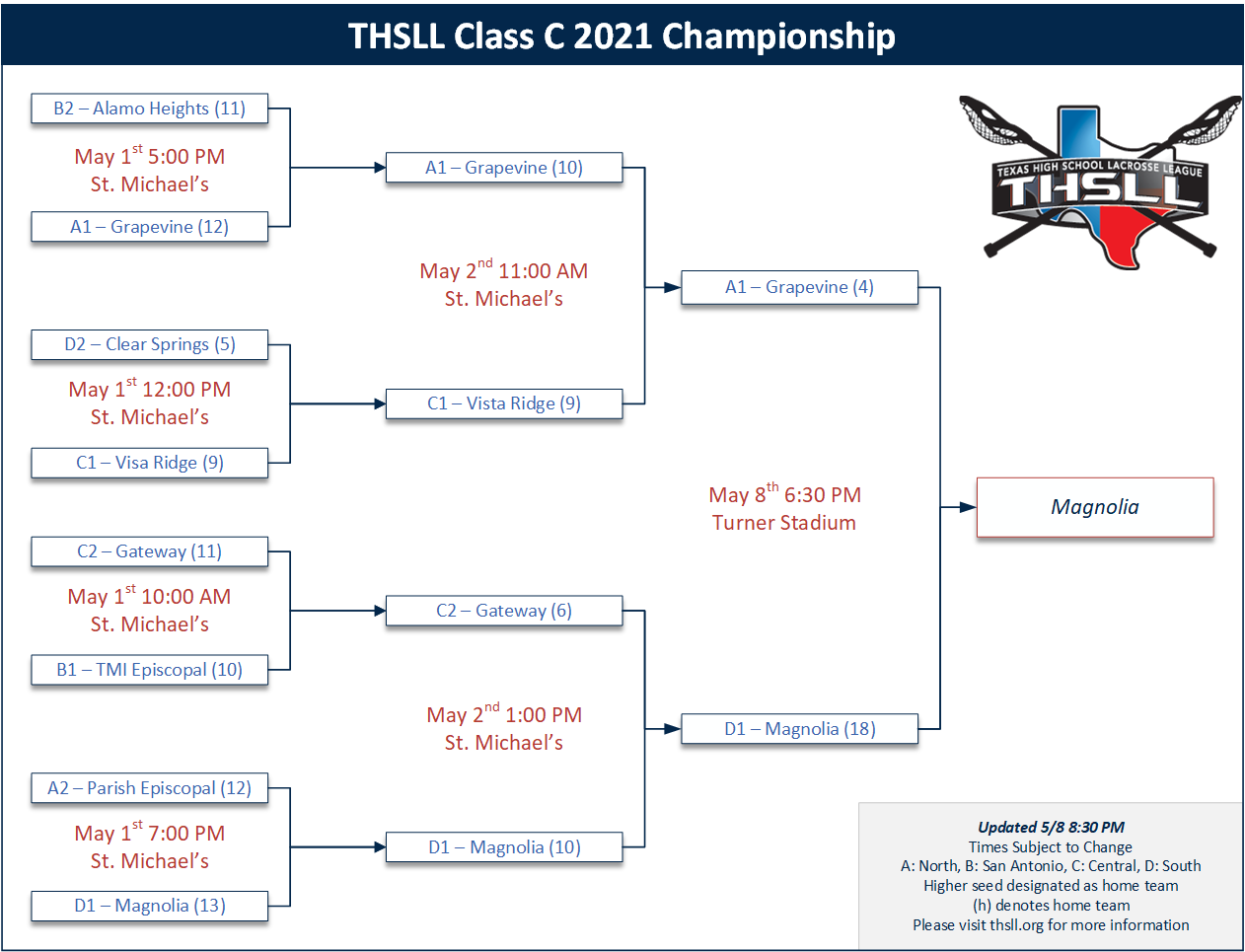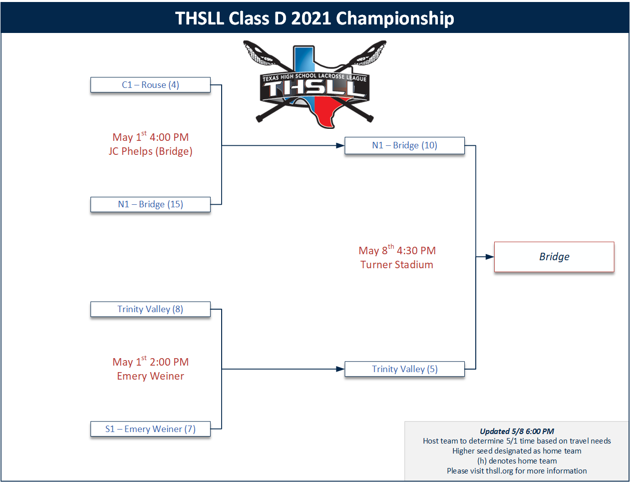| 05/08 | Trinity Valley School vs Bridge Lacrosse | Class D State Championship | Bridge Lacrosse | 5-10 |